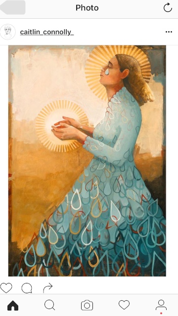 Tears - her dress is made of tears. There's a tear on her face. The tears could be tears of joy from feeling that connection with God and knowing you are His beloved daughter. They could also be tears of pain and sadness from the challenges that are an inevitable part of life.